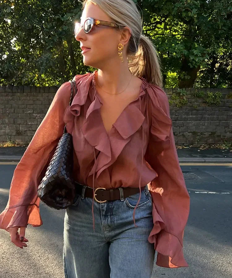 Transparante Volantblouse in Bruin – Feminin, Elegant & Uitgesproken