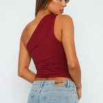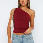 Geef uw garderobe een vleugje verfijning en elegantie met onze verbluffende bordeauxrode top met één schouder en ruches. Dit veelzijdige kledingstuk biedt een flatterende pasvorm met een stijlvolle ruchesdetail dat uw rondingen accentueert en uw silhouet benadrukt. Of u nu op weg bent naar een casual uitje, een romantische date of een weekendtrip, deze top is de perfecte keuze voor elke gelegenheid.